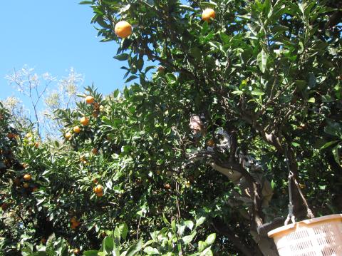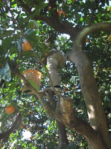高い所にあるみかんは木を登ってチョキチョキ切っていきます。